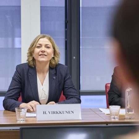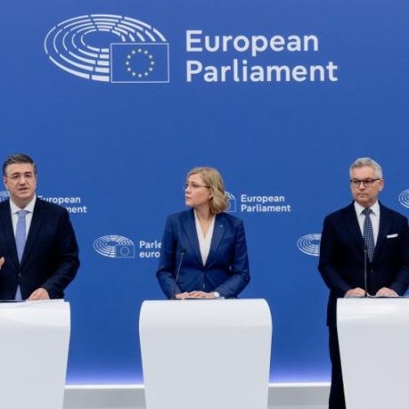 Apostolos Tzitzikostas (stânga), Henna Virkkunen (centru) și Magnus Brunner (dreapta) în timpul conferinței de presă…