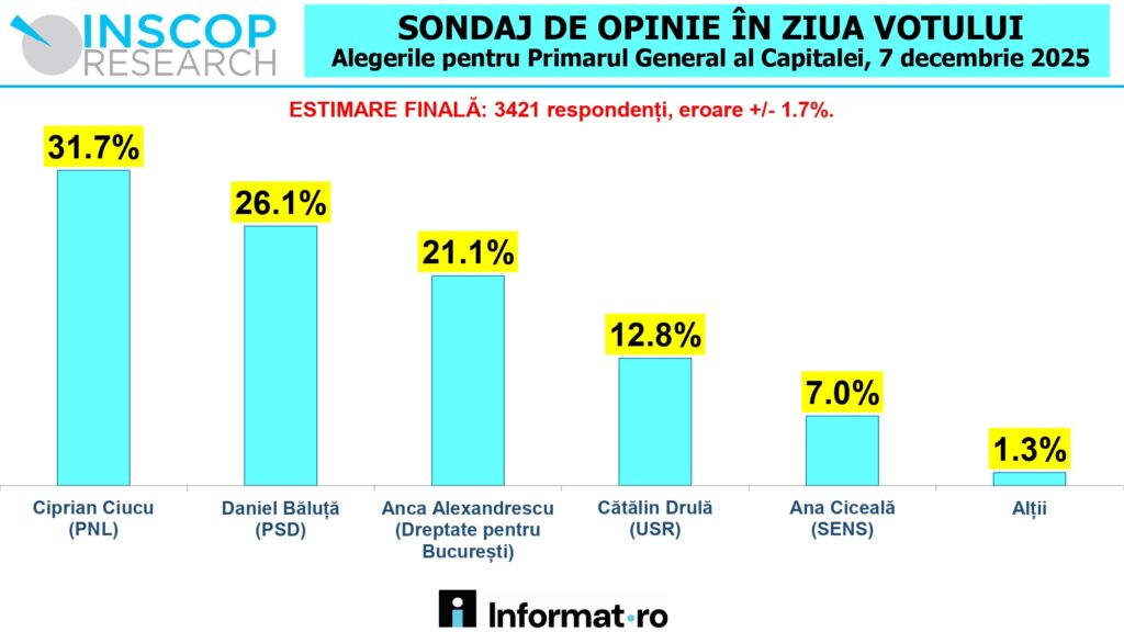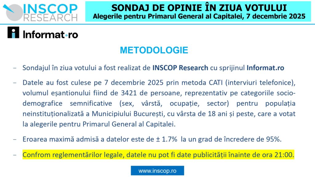 Inscop Research a realizat, cu sprijinul informat.ro, un sondaj în ziua votului la alegerile pentru Primarul General al Capitalei. Datele au fost culese pe 7 decembrie 2025 prin metoda CATI (interviuri telefonice), volumul eșantionului fiind de 3421 de persoane, reprezentativ pe categoriile socio-demografice semnificative (sex, vârstă, ocupație, sector) pentru populația neinstituționalizată a Municipiului București, cu vârsta de 18 ani și peste, care a votat la alegerile pentru Primarul General al Capitalei. Eroarea maximă admisă a datelor este de ± 1.7% la un grad de încredere de 95%.