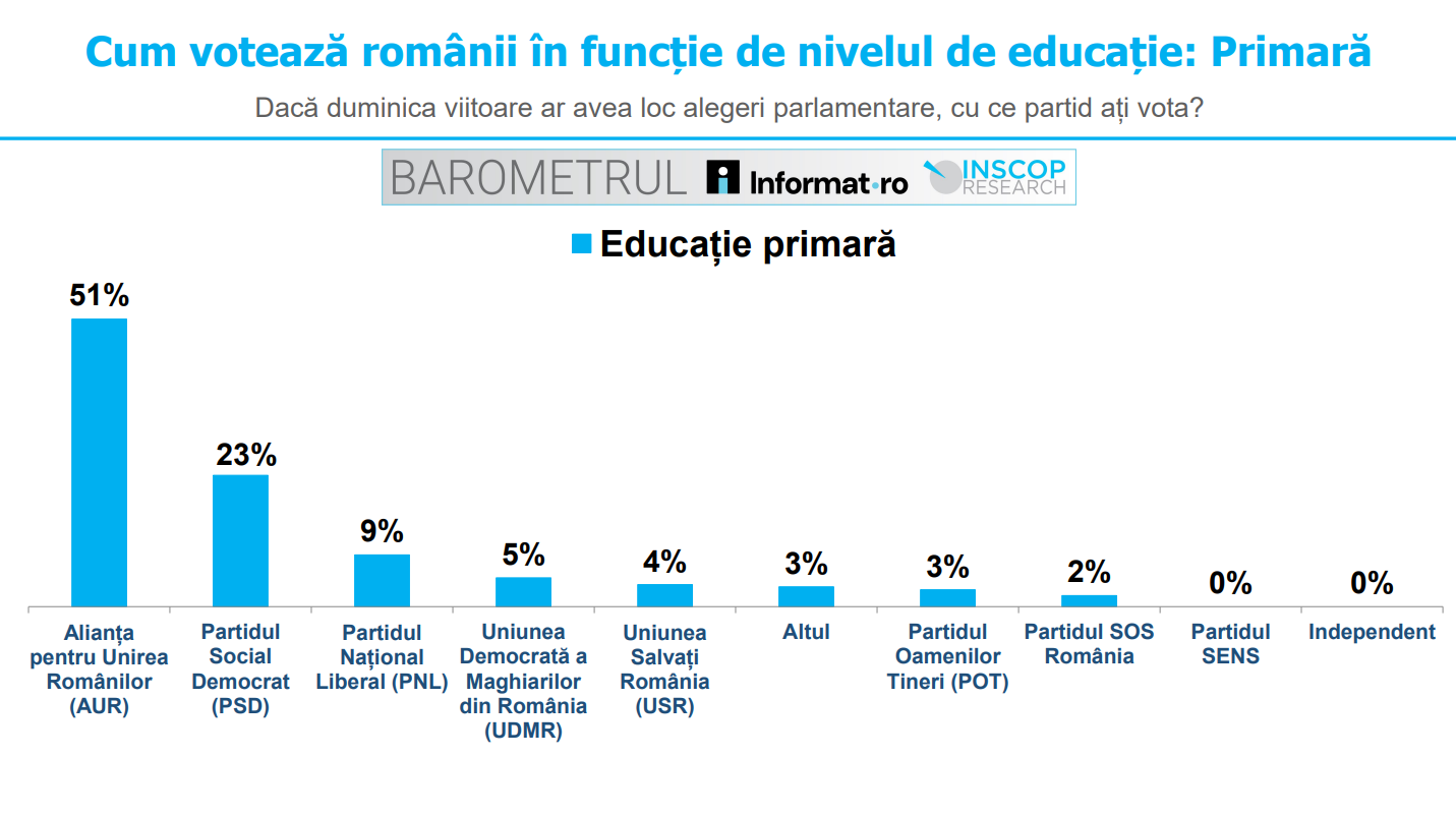 51% dintre persoanele cu educație primară ar alege să voteze cu AUR dacă duminica viitoare ar avea loc alegeri parlamentare. 18% dintre aceștia optează pentru PSD, 9% pentru PNL, 5% pentru UDMR, 4% pentru USR, 3% pentru alt partid, 3% pentru POT, iar 3% pentru SOS România. Nu au fost exprimate preferințe de vot pentru partidul SENS sau pentru un candidat independent.
