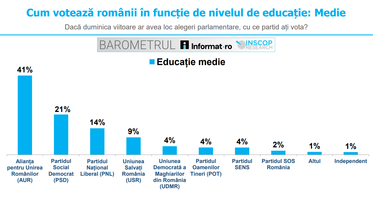 Întrebați cu ce partid ar vota dacă duminica viitoare ar avea loc alegeri parlamentare, 41% dintre românii cu educație medie declară că ar alege AUR, 21% PSD, 14% PNL, 9% USR, 4% UDMR, 4% POT, 4% SENS, iar 2% SOS România. 1% aleg alt partid și 1% un candidat independent.