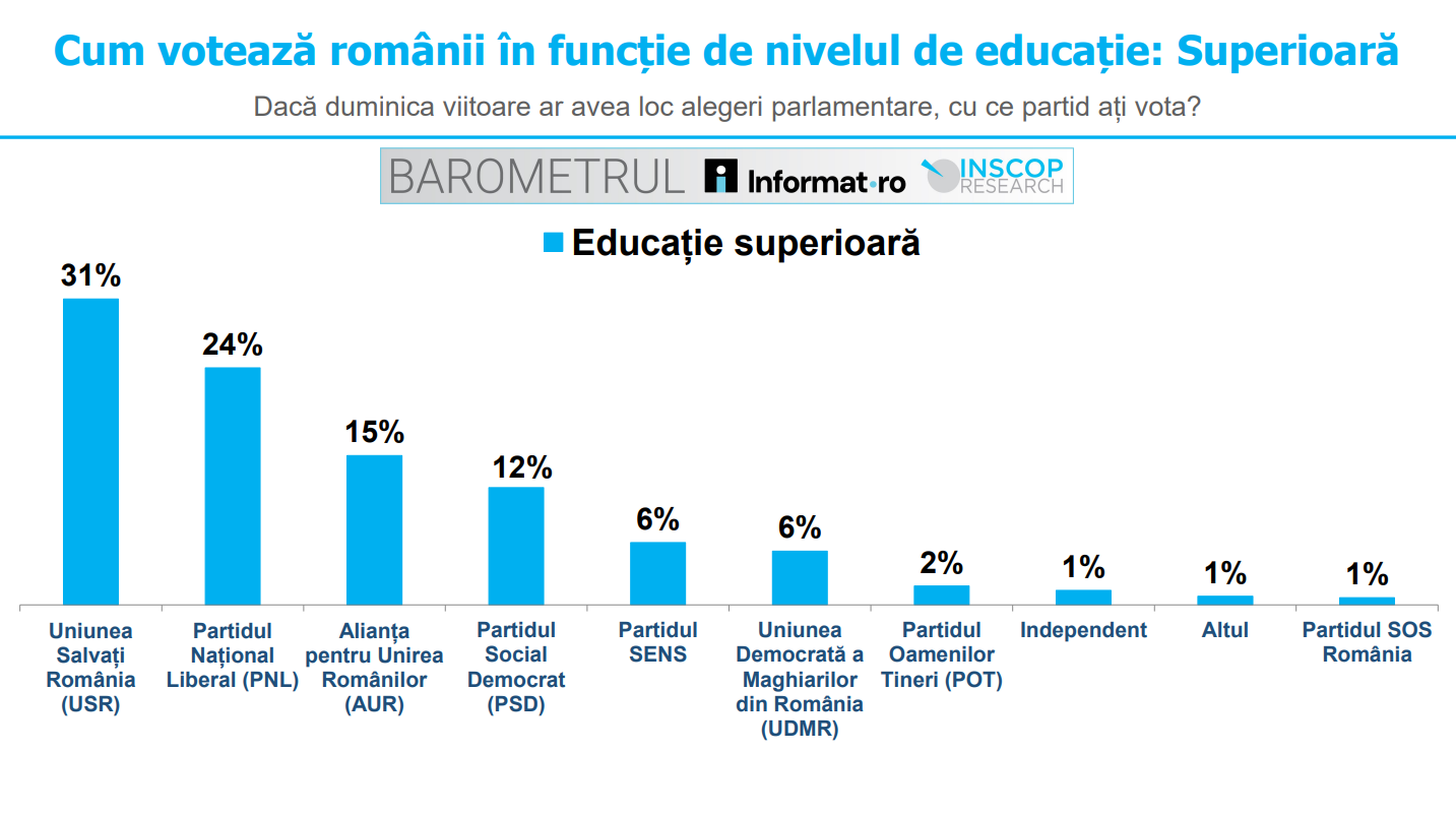 31% dintre votanții cu educație superioară își exprimă preferința pentru USR. 24% dintre aceștia și-ar exprima votul pentru PNL, 15% pentru AUR, 12% pentru PSD, 6% pentru SENS, 6% pentru UDMR, în timp ce 2% pentru POT. 1% susțin un candidat independent, 1% un alt partid, iar 1% SOS România.