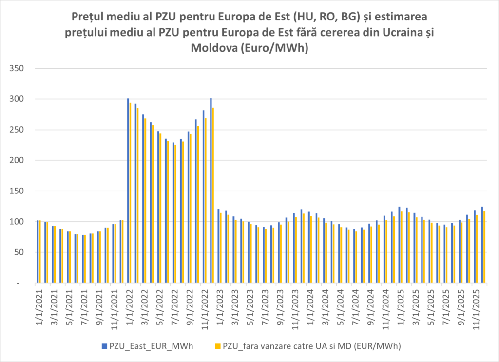 În baza seriilor lunare PZU (€/MWh) pentru România, Ungaria, Bulgaria (din ENTSO-E / Energy-Charts), am calculat un indicator lunar „cerere UA+MD” estimat (în % din cererea combinată a Estului) și elasticitatea preț-cerere, estimând prețul mediu al PZU pentru Europa de Est (HU, RO, BG) fără cerea de gaze din Ucraina și Moldova.